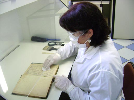 Nesse Laboratório são realizados os procedimentos de assepsia e, quando necessário, de restauração. A equipe do laboratório é responsável pelo monitoramento periódico das peças e do espaço de armazenamento, assegurando a preservação dos acervos. Os procedimentos realizados e as técnicas empregadas são as mais variadas e compreendem desde limpeza mecânica com pó de borracha até intervenções químicas para clareamento e desacidificação. O Laboratório poderá, ainda, prestar serviços de ‘Conservação’ e/ ou ‘Restauração’ de documentos